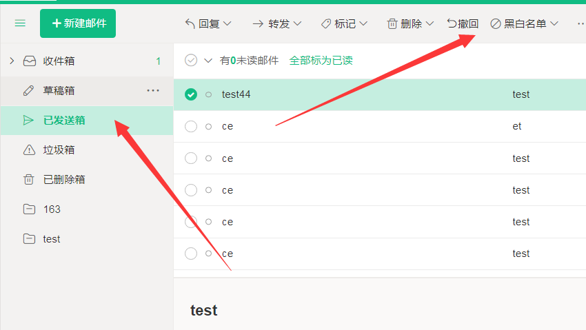 用邮箱名和密码登录进Web页面,选择发件箱,点击您刚发的,并且想要撤回的邮件,在工具条上点击撤回按钮,如下图: